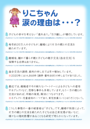 りこちゃんリーフレットを2021年版に改訂致しました。「りこちゃんリーフレット」は、別居・離婚によって親子交流が断たれると何が問題なのか、日本に実態がどうなっているのか、どうすべきなのかが一 目でわかるようになっています。
