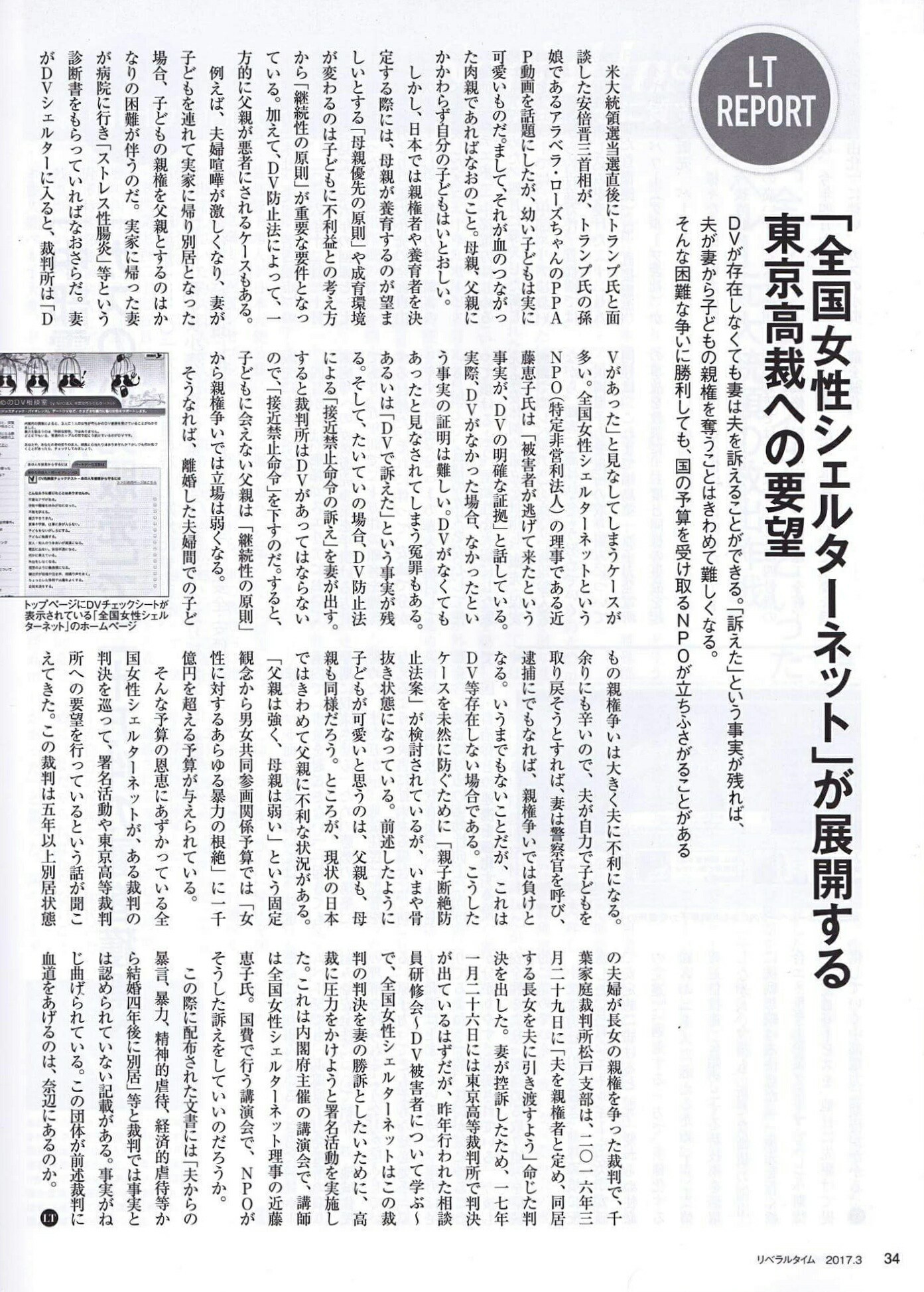 そんな予算の恩恵にあずかっている全国女性シェルターネットが、ある裁判の判決を巡って、署名活動や東京高等裁判所への要望を行っているという話が聞こえてきた。この裁判は五年以上別居状態の夫婦が長女の親権を争った裁判で、千葉家庭裁判所松戸支部は、二〇一六年三月二十九日に「夫を親権者と定め、同居する長女を夫に引き渡すよう」命じた判決を出した。妻が控訴したため、一七年一月二十六日には東京高等裁判所で判決が出ているはずだが、昨年行われた相談員研修会〜DV被害者について学ぶ〜で、全国女性シェルターネットはこの裁判の判決を妻の勝訴としたいために、高裁に圧力をかけようと署名活動を実施した。これは内閣府主催の講演会で、講師は全国女性シェルターネット理事の近藤恵子氏。国費で行う講演会で、NPOがそうした訴えをしていいのだろうか。